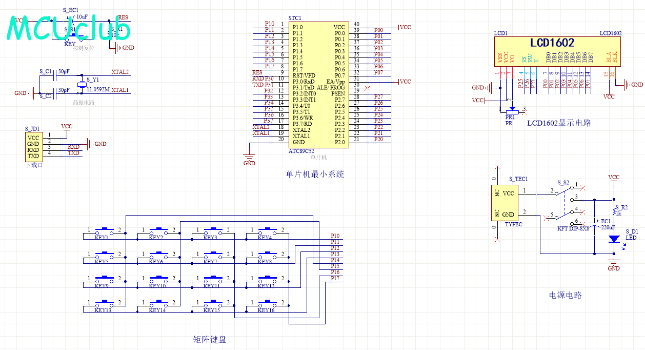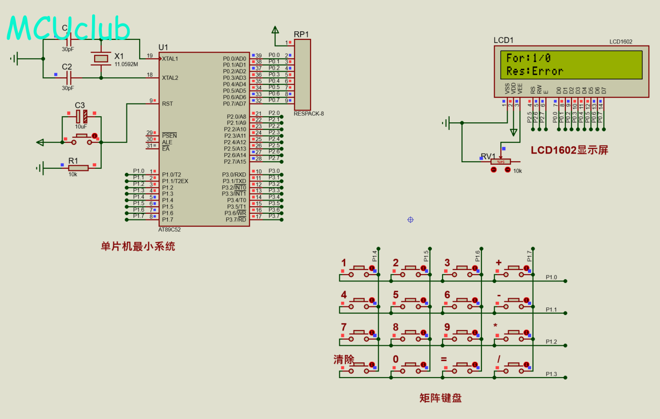 关键词:AT89C52;计算器;LCD1602液晶显示模块;矩阵键盘;