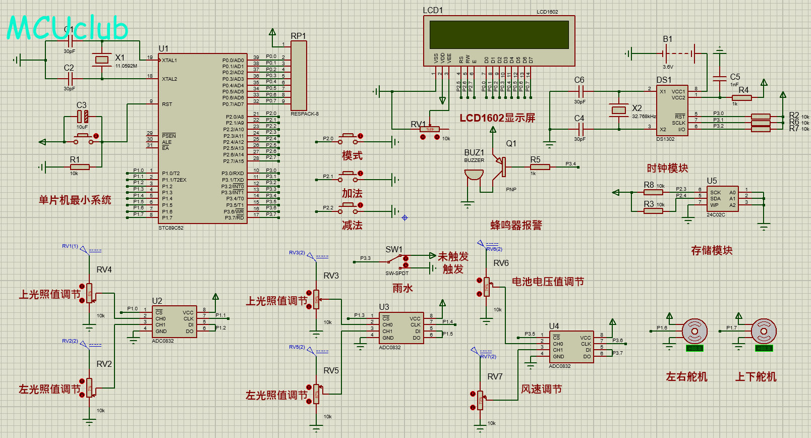 4、通过电位器配合ADC0832模拟采集太阳能板的电压,如果在允许太阳能板进行追光时检测到电压低于3V,则说明太阳能板损坏,进行蜂鸣器报警