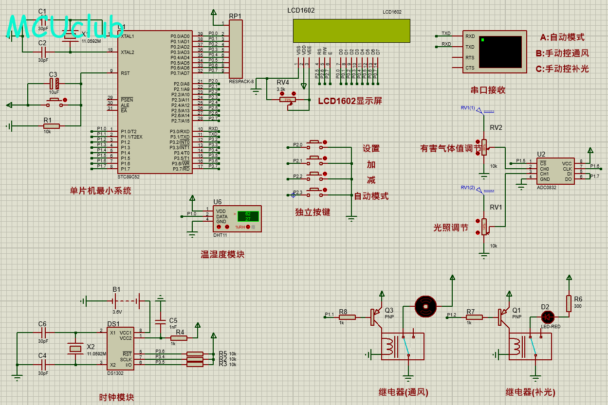 2、通过MQ-135配合ADC0832检测鸡舍内有害气体,当气体浓度大于设置最大值,进行通风