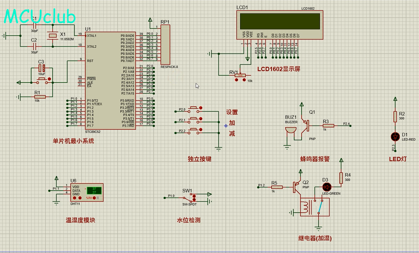 1、通过DHT11获取湿度值,当湿度值低于设置最小值,则启动加湿器加湿,大于设置最大值,则停止加湿