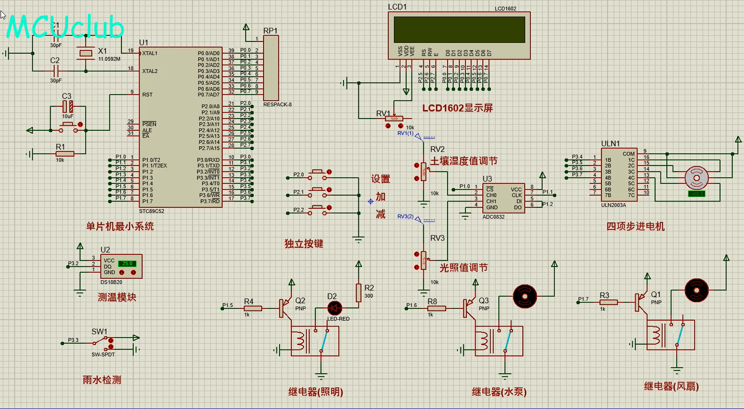 3、通过光敏电阻检测光照值,当光照值小于设置最小值时则自动进行补光;当光照值大于设置最大值时,则自动打开遮雨棚进行遮光(四相步进电机模拟)