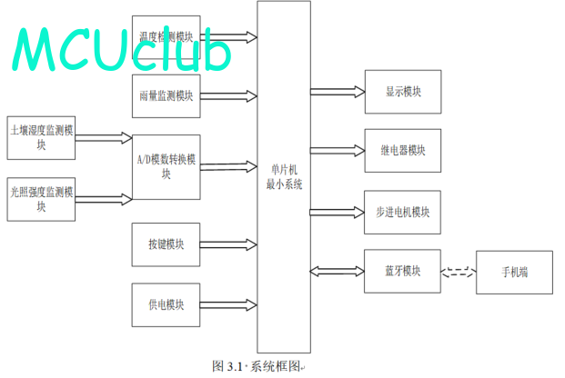 2、通过土壤湿度传感器检测湿度值,当湿度值低于设置最小值时,进行水泵浇水