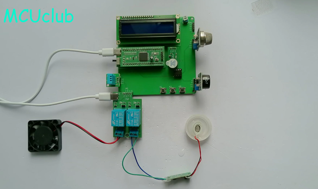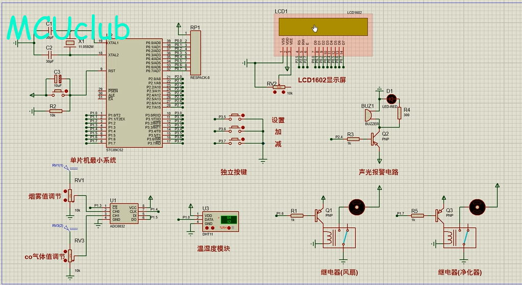 4、通过按键设置温湿度上下限值、烟雾及CO最大值,另外,当烟雾值小于等于设置最大值并且CO值小于等于设置最大值时,可手动控制风扇或净化器开关