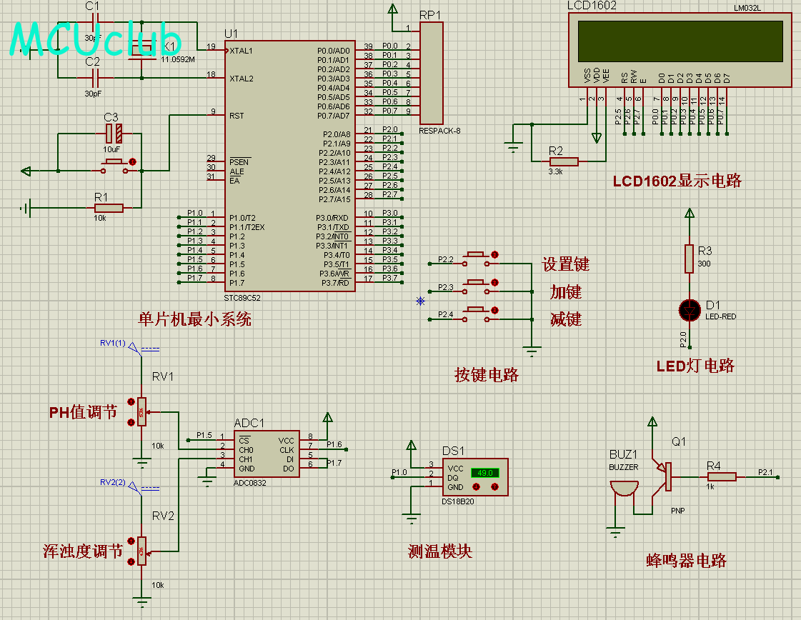 1、通过防水式DS18B20检测水温,当水温不在设置的上下限值直接,则声光报警