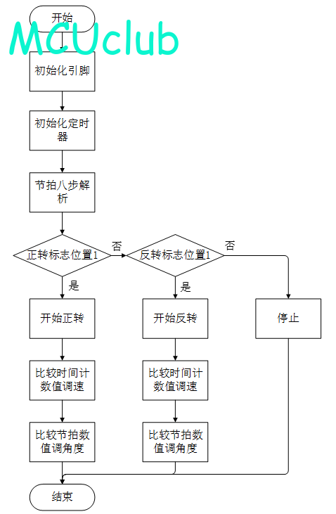 首先初始化引脚,然后初始化定时器,在定时器中断函数中进行步进电机八步解析,然后根据正转或反转标志位决定正反转。另外,通过比较时间计数值决定步进电机转速,比较节拍数决定步进电机转动角度。