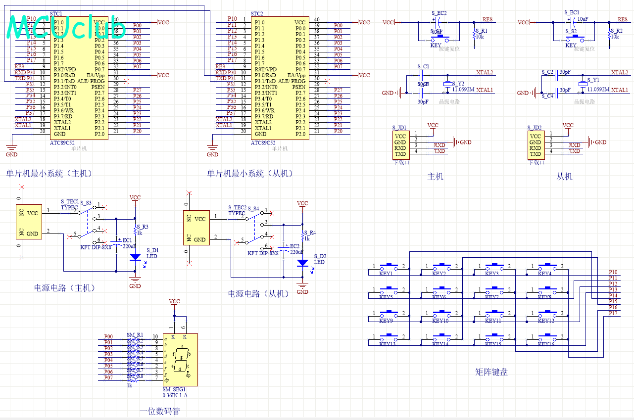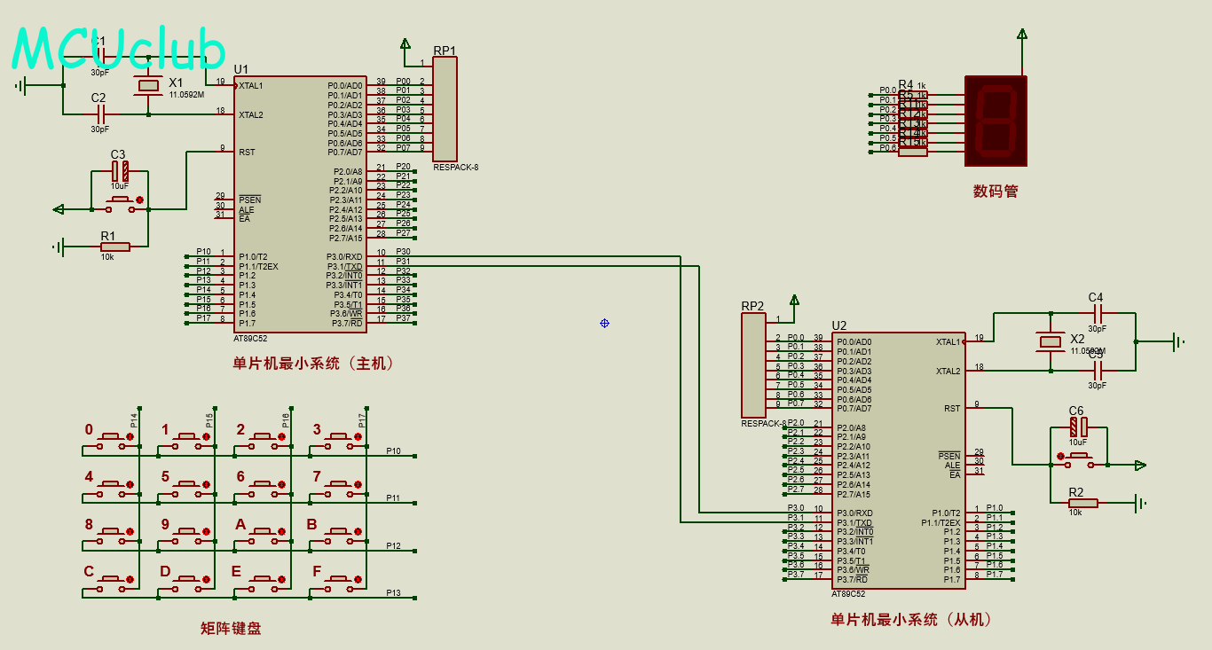 两片单片机利用串行口进行串行通信:串行通信用矩阵按键,将0~F 从主机传输到从机,
