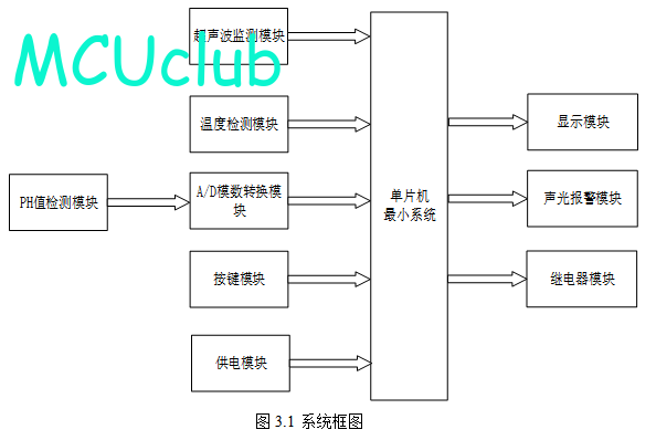 本设计以单片机为核心控制器,加上其他模块一起组成此次设计的整个系统,其中包括中控部分、输入部分和输出部分。中控部分采用了单片机控制器,其主要作用是获取输入部分的数据,经过内部处理,逻辑判断,最终控制输出部分。输入由五部分组成,第一部分是超声波检测模块,通过该模块检测鱼缸的水位;第二部分是温度检测模块,通过该模块检测鱼缸中的水温;第三部分是PH值检测模块,通过该模块检测鱼缸中的PH值浓度;第四部分是按键模块,通过该模块可以设置鱼缸中的温度和水位等;第五部分是供电模块,通过该模块可给整个系统进行供电。输出由三部分组成,第一部分是显示模块,通过该模块可以显示监测的数据及其设置值等;第二部分是报警模块,检测到水温或者水位不在设置的范围之内进行声光报警提醒;第三部分是继电器模块,通过继电器控制加水、排水、升温、降温、充氧。具体系统框图如图3.1所示。