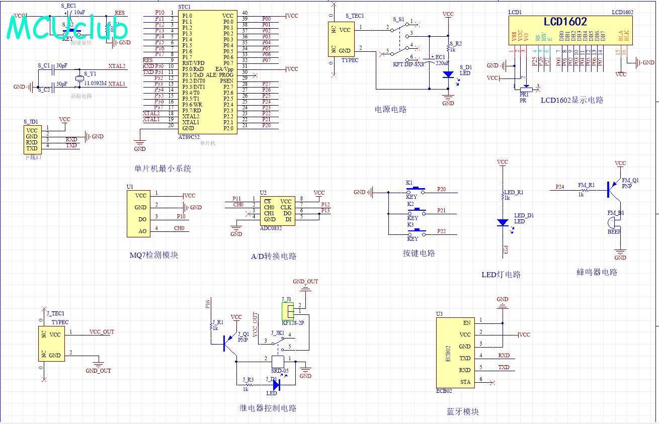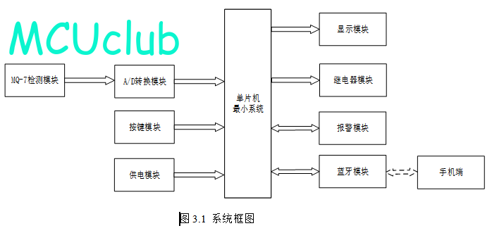 本设计以单片机为核心控制器,加上其他模块一起组成此次设计的整个系统,其中包括中控部分、输入部分和输出部分。中控部分采用了单片机控制器,其主要作用是获取输入部分的数据,经过内部处理,逻辑判断,最终控制输出部分。输入由三部分组成,第一部分是MQ-7检测模块,通过该模块检测煤气值;第二部分是按键模块,通过该模块可以设置上限值,可以手动控制风扇、切换模式;第三部分是供电模块,通过该模块可给整个系统进行供电。输出由三部分组成,第一部分是显示模块,通过该模块可以显示煤气值;第二部分是继电器模块,该模块由两个继电器分别控制风扇工作;第三部分是报警模块,当检测到烟雾浓度超过设置的最大值时,进行声光报警处理。除此之外,蓝牙模块既作为输入又作为输出,蓝牙模块和手机进行连接,可以将监测的数据传输到用户手机端,用户也可以通过手机端发送指令进行工作。具体系统框图如图3.1所示。