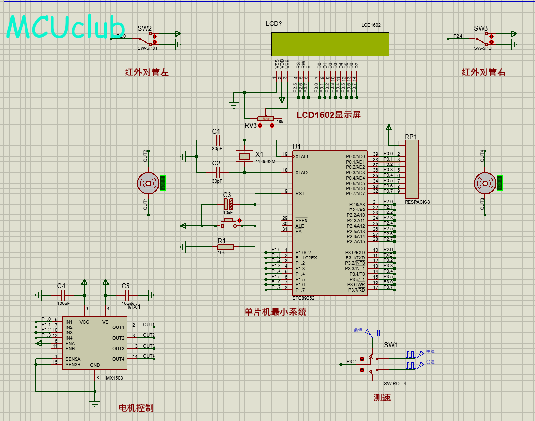 2、通过红外测速管进行测速,并将速度值显示在LCD1602显示屏上