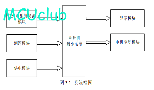 本设计以单片机为核心控制器,加上其他模块一起组成此次设计的整个系统,其中包括中控部分、输入部分和输出部分。中控部分采用了单片机控制器,其主要作用是获取输入部分的数据,经过内部处理,逻辑判断,最终控制输出部分。输入由三部分组成,第一部分是超声波检测模块,通过该该模块检测小车红外对射管检测模块,该模块通过一对红外对射管进行循迹;第二部分是测速检测模块,通过该模块进行测速;第三部分是供电模块,通过该模块可给整个系统进行供电。输出由两部分组成,第一部分是显示模块,通过该模块可以显示速度;第二部分是电机器模块,通过该模块驱动小车。具体系统框图如图3.1所示。