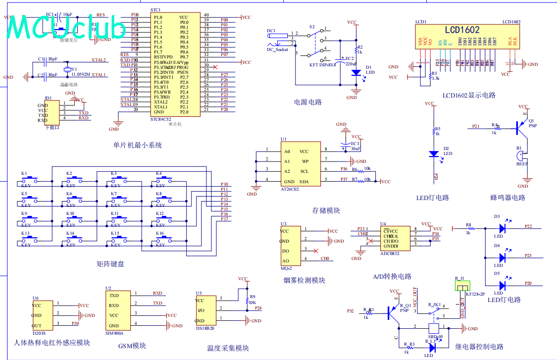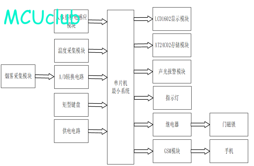 本设计以STC89C52单片机为核心控制器,加上其他的模块一起组成防火防盗的整个系统,其中包含中控部分、输入部分和输出部分。中控部分采用了STC89C52单片机,其主要作用是获取输入部分数据,经过内部处理,控制输出部分。输入由五部分组成,第一部分是人体热释电检测模块,通过该模块检测是否有人,第二部分是温度检测模块,通过该模块检测当前的温度;第三部分是烟雾检测模块和A/D模数转换电路构成,检测环境中的烟雾浓度;第四部分4*4矩型键盘,通过该键盘可切换界面、设置温度及其烟雾的最大值、输入密码、修改密码等;第五部分是供电电路,给整个系统进行供电。输出由六部分组成,第一部分是LCD1602显示模块, 通过该模块可以显示输入密码、密码错误、门开、重置密码成功、锁定时间及其当前的温度、烟雾浓度等等;第二部分是AT24C02存储模块,将用户设置的密码存储在该模块中,实现修改密码掉电保存;第四部分是声光报警模块,当检测到烟雾或者温度大于用户设置的最大值进行声光报警;第五部分是LED,当密码输入正确时,灯亮;第六部分时是继电器控制门磁锁,模拟开门;第七部分是GSM模块和手机进行连接,当检测到烟雾火使温度大于用户设置的最大值,给用户发送短信。