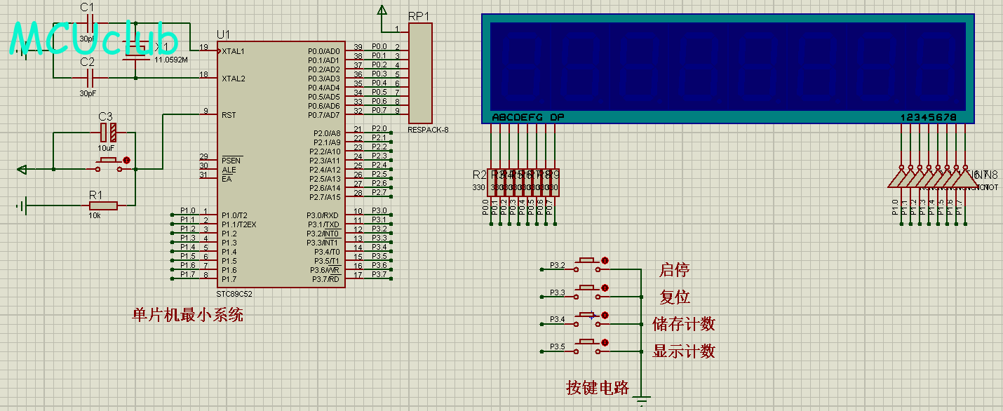 (2)设置1个独立按键用作启/停控制,该键按下时开始计时,计时精度10毫秒,再按一下停止计时,
