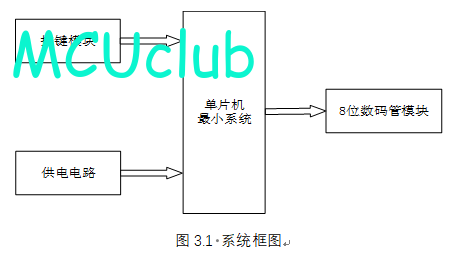 系统进行供电。输出是数码管显示模块,显示当前计时和显示当前查看的储存计时,系统框图如图3.1所示。