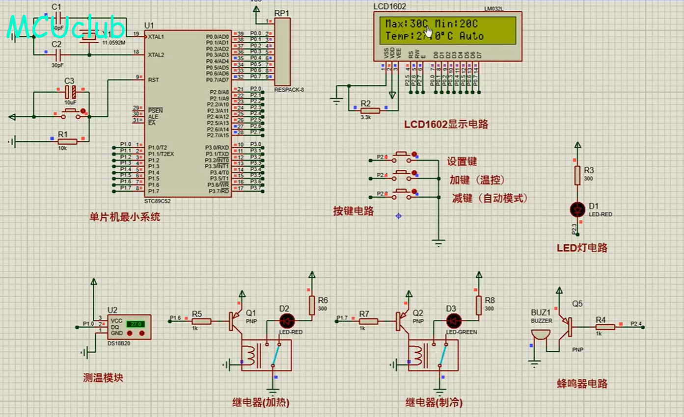 2、通过按键设置温度上下限值,可以手动控制加热制冷以及切换模式