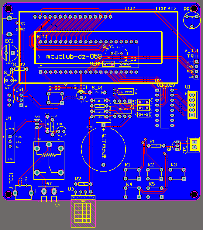注意:PCB图中间有一个项目编号,隐藏在单片机底座下,插入单片机后不会看到。如果想截没有项目编号的PCB图,可在PCB源文件中点击删除。另外,如果想在实物PCB板上加自己的信息(比如日期、学号、姓名等),可联系客服。