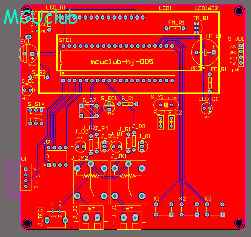 注意:PCB图中间有一个项目编号,隐藏在单片机底座下,插入单片机后不会看到。如果想截没有项目编号的PCB图,可在PCB源文件中点击删除。另外,如果想在实物PCB板上加自己的信息(比如日期、学号、姓名等),可联系客服。