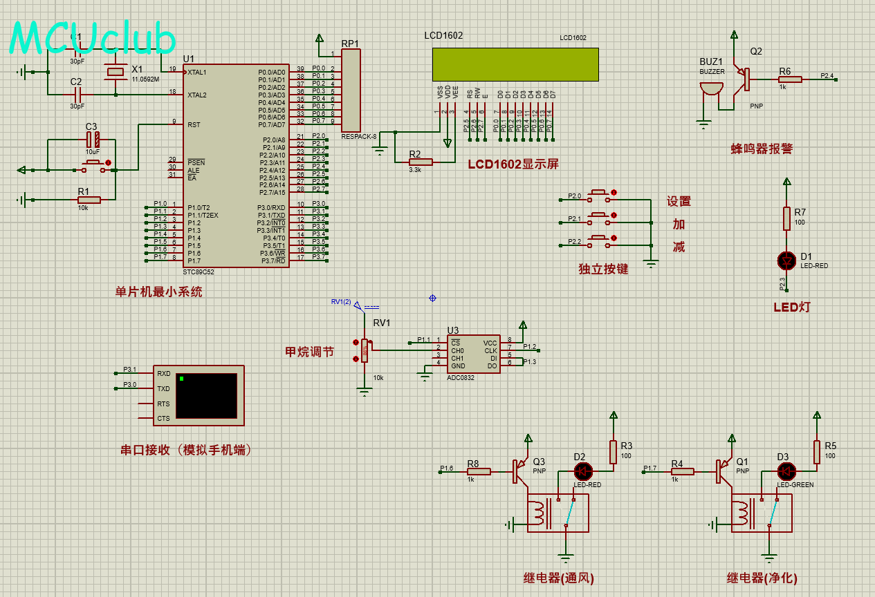 1、通过MQ-4检测甲烷值,超过设置最大值进行声光报警,并开启风扇和净化器