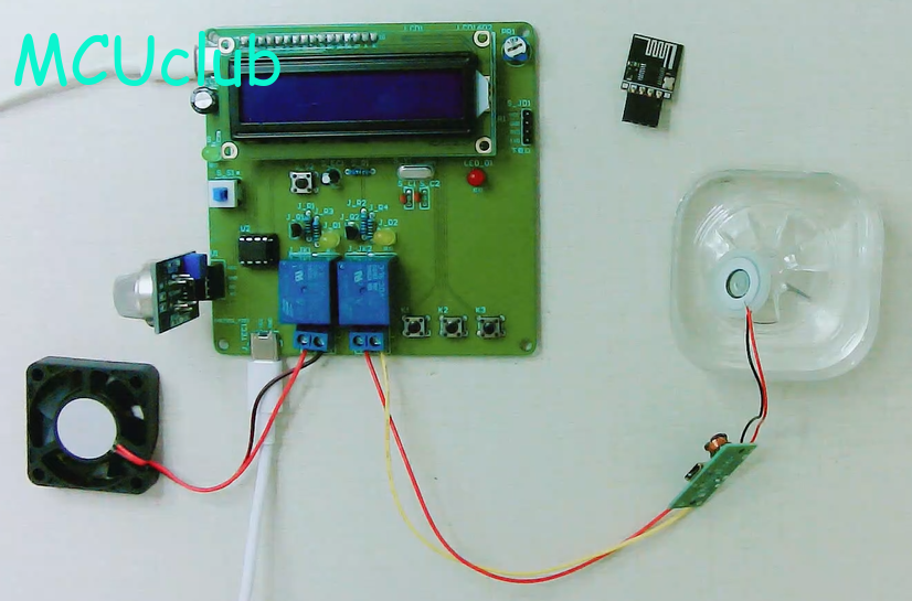 1、通过MQ-5检测天然气或煤气值,超过设置最大值进行声光报警,并开启风扇和净化器