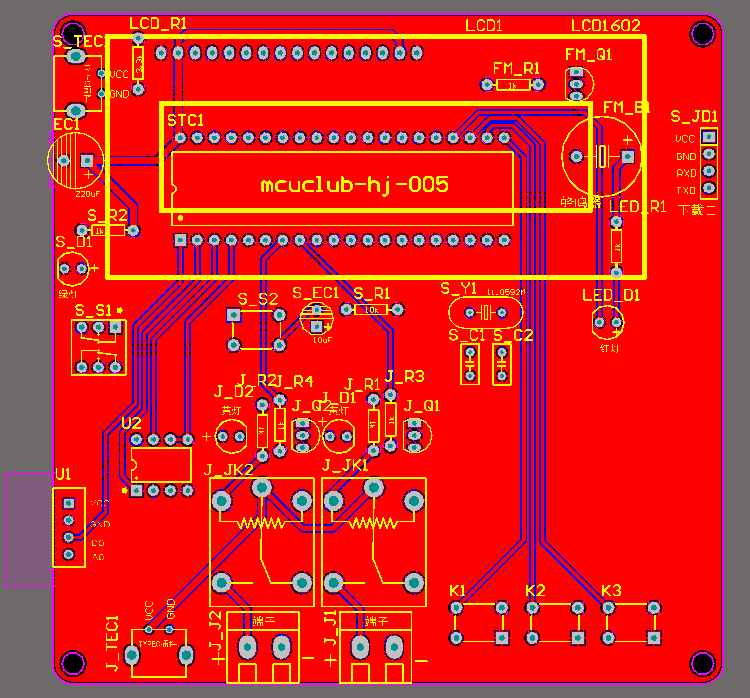 注意:PCB图中间有一个项目编号,隐藏在单片机底座下,插入单片机后不会看到。如果想截没有项目编号的PCB图,可在PCB源文件中点击删除。另外,如果想在实物PCB板上加自己的信息(比如日期、学号、姓名等),可联系客服。