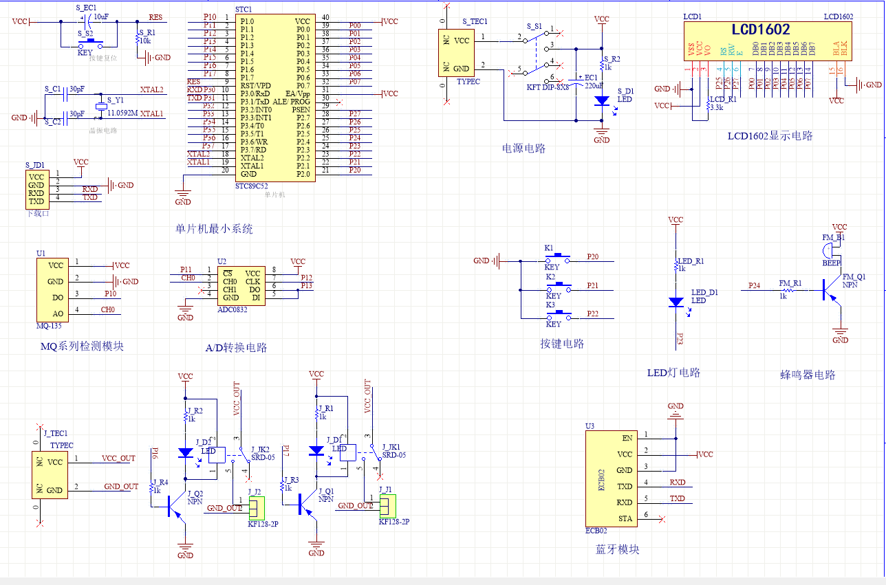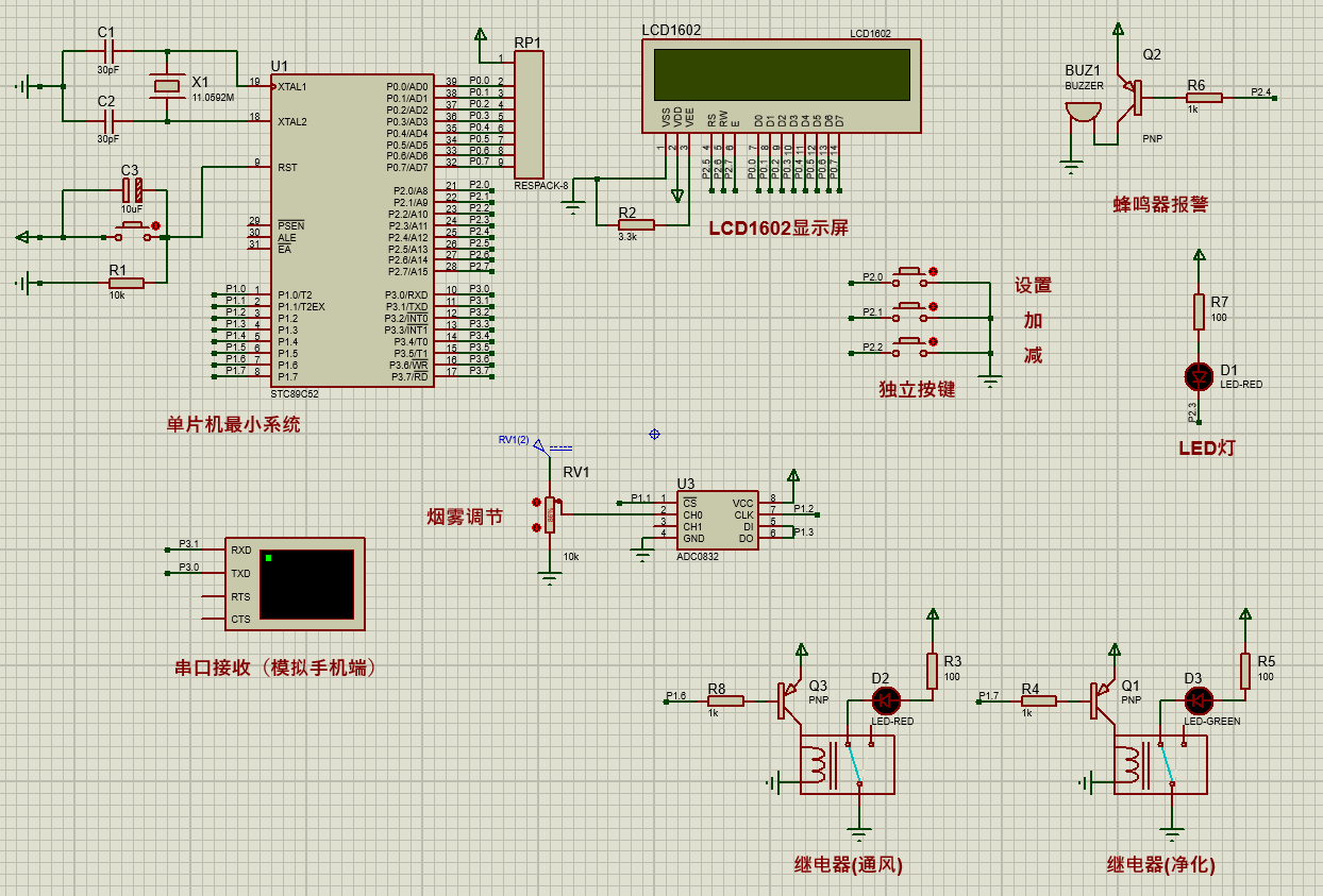 有毒有害混合气体中各组分浓度的检测在煤矿瓦斯、石油化工、环境保护、城市地下井廊等领域有着广泛的应用。本文首先对比了常见的气体检测方法,通常气体检测仪器选择为气色相谱仪,由于体积较大、成本高且只能检测单一气体所以不适合用于公共交通的气体检测。半导体气体传感器成本低、体积小、检测较为灵敏度,因此此次设计一款有害混合气体检测仪,本文基于单片机技术、传感器技术设计一款有害气体混合浓度检测系统分析仪。本文主要研究可以分为软件和硬件两大部分来进行设计:硬件部分,采用STC89C52单片机作为此次设计的主控芯片,采用MQ-135混合气体检测模块检测环境中的有害混合气体浓度,检测到有害混合气体浓度大于设置的最大值,进行声光报警,并自动打开通风继电器和空气净化器,并将检测的数据显示在液晶显示屏上。此次设计还增加蓝牙终端设计,通过手机连接蓝牙,将检测的有害混合气体浓度传输管理人员的手机上,管理人员可以远程进行查看,还可以远程控制通风和空气净化的工作;软件部分,该设计通过AD进行原理图和PCB的绘制,Keil5进行程序的撰写,通过Visio进行流程图的绘制。通过软件和硬件配合,此次设计可以实现对环境中的有害混合气体进行实时监测和控制的功能,保障井下工作人员的工作安全。