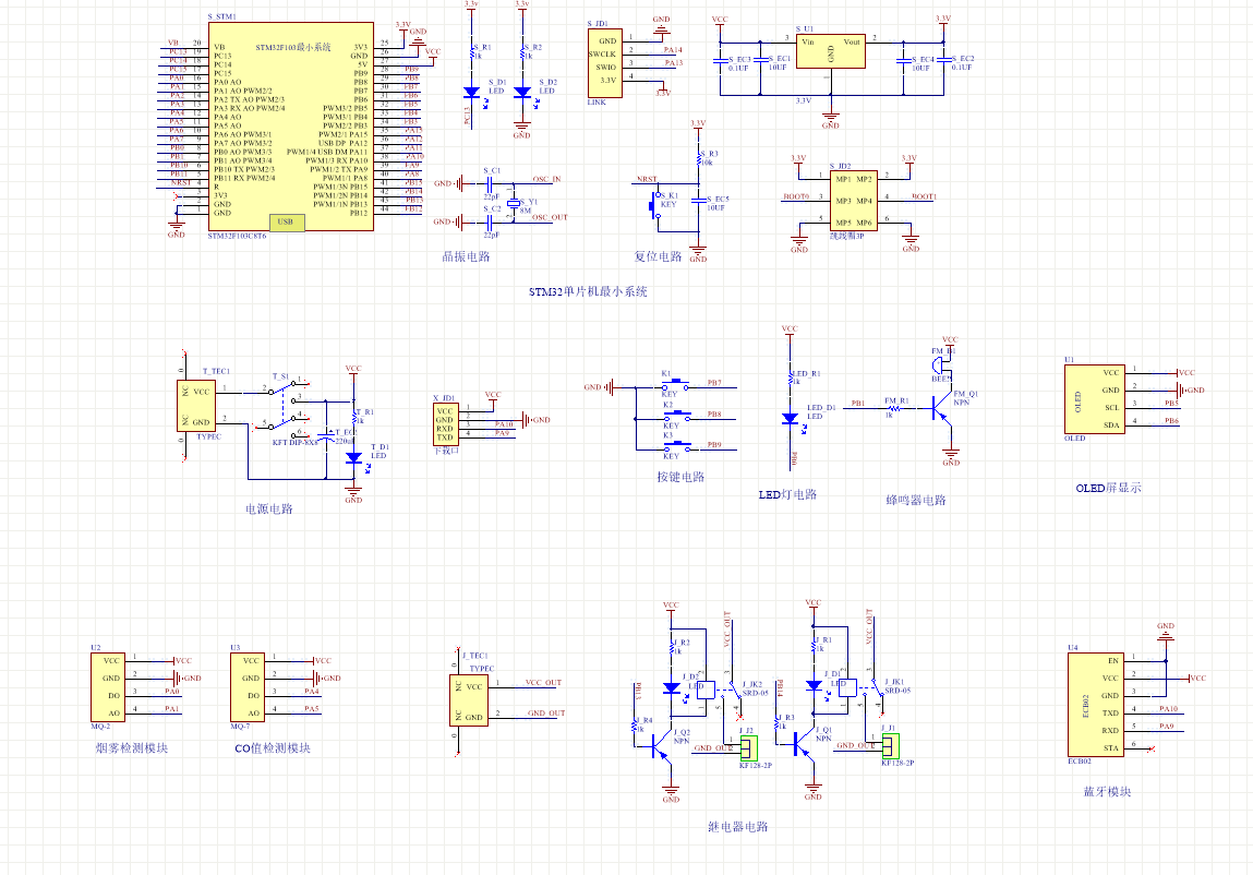- 对煤气罐监控终端硬件按模块进行了器件选型和电路设计。硬件电路设计包括主控模块、煤气浓度传感器、烟雾检测模块、蓝牙模块电源模块及PCB的设计。