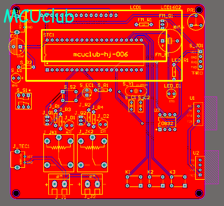 注意:PCB图中间有一个项目编号,隐藏在单片机底座下,插入单片机后不会看到。如果想截没有项目编号的PCB图,可在PCB源文件中点击删除。另外,如果想在实物PCB板上加自己的信息(比如日期、学号、姓名等),可联系客服。