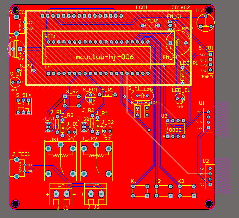 注意:PCB图中间有一个项目编号,隐藏在单片机底座下,插入单片机后不会看到。如果想截没有项目编号的PCB图,可在PCB源文件中点击删除。另外,如果想在实物PCB板上加自己的信息(比如日期、学号、姓名等),可联系客服。