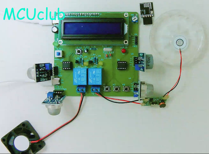 1、通过MQ-2检测烟雾值,超过设置最大值进行声光报警,并开启风扇和净化器
