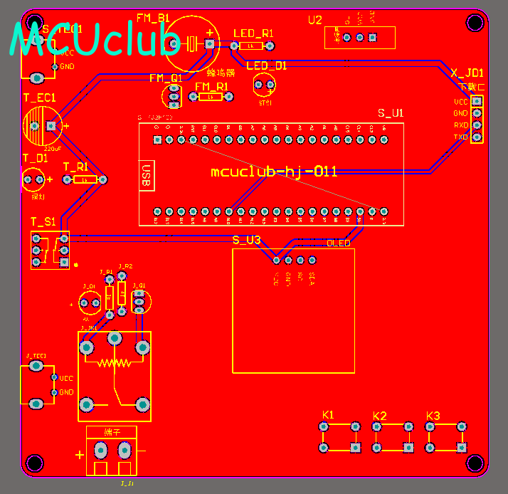 注意:PCB图中间有一个项目编号,隐藏在单片机底座下,插入单片机后不会看到。如果想截没有项目编号的PCB图,可在PCB源文件中点击删除。另外,如果想在实物PCB板上加自己的信息(比如日期、学号、姓名等),可联系客服。