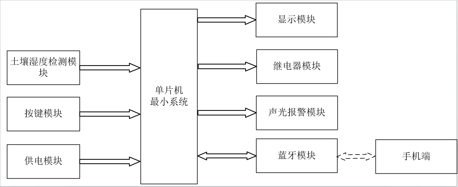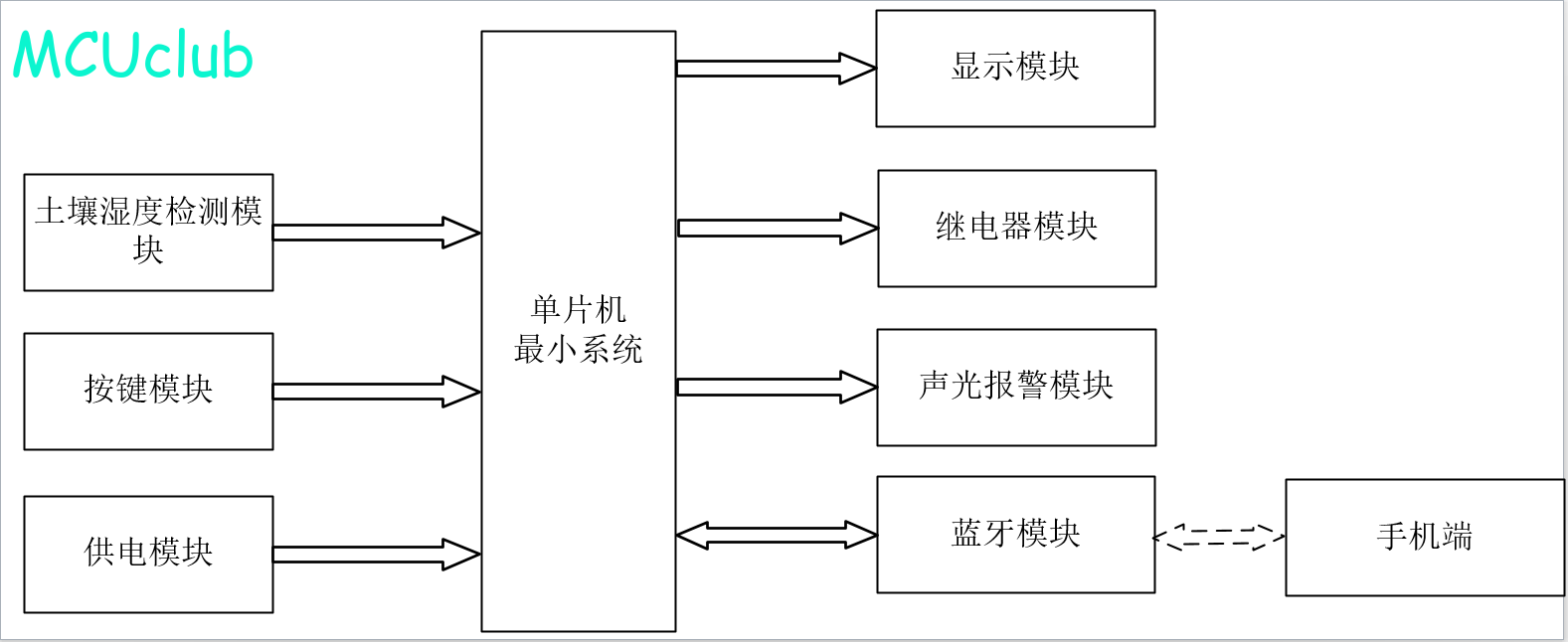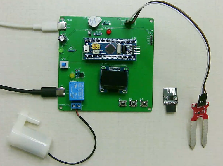 1、通过土壤湿度传感器测量土壤湿度,当湿度值小于设置最小值,声光报警,并自动打开水泵浇水,直到湿度大于设置最大值