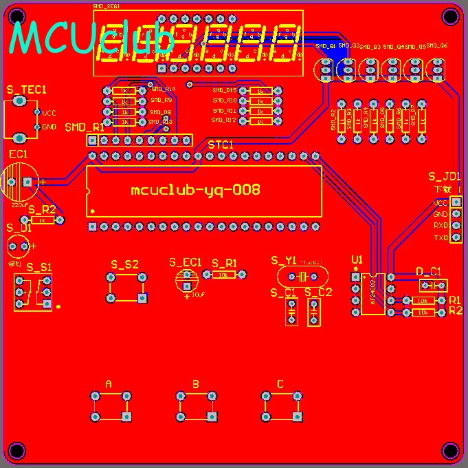 注意:PCB图中间有一个项目编号,隐藏在单片机底座下,插入单片机后不会看到。如果想截没有项目编号的PCB图,可在PCB源文件中点击删除。另外,如果想在实物PCB板上加自己的信息(比如日期、学号、姓名等),可联系客服。