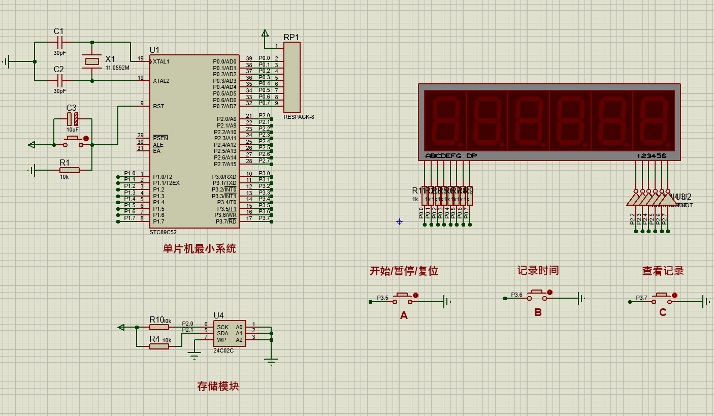2、通过按键’B‘在计时中,可按多次,作为多个时间结点,并通过AT24C02将数据保存