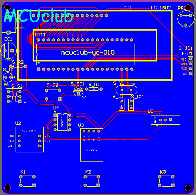 注意:PCB图中间有一个项目编号,隐藏在单片机底座下,插入单片机后不会看到。如果想截没有项目编号的PCB图,可在PCB源文件中点击删除。另外,如果想在实物PCB板上加自己的信息(比如日期、学号、姓名等),可联系客服。
