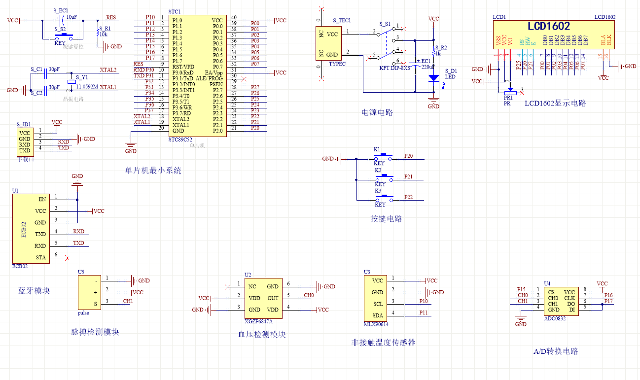 脉搏、血压、体温作为人们最为常见的一种生理现象,经常用来反应人们的心脏或者血管的状态,通过测量这些参数可以为医护人员提供对疾病及其血流等生理检测的依据。此次设计的这款基于单片机的人体生理参数监测系统设计,该系统采用STC89C52单片机作为主控芯片,通过脉搏检测模块、血压监测模块、非接触温度传感器,并将检测的脉搏、血压、温度显示再液晶显示屏LCD1602上。该系统的工作如下:1.硬件设计,通过选用脉搏检测模块、血压监测模块、温度检测模块完成硬件设计。2.软件设计,通过C语言作为此次设计的编程语言,使得硬件实现对数据进行采集,然后进行数据的处理,最后进行数据的显示及其提醒等,最后将检测的数据显示再液晶显示屏LCD1602上,医护人员通过显示屏实时观察被检测者的脉搏、血压以及温度的变化,并针对检测结果进行及时处理,且该设备操作检测较为简单,用户也可以进行自我检测。所以此次设计具有一定的研究价值和实际意义。