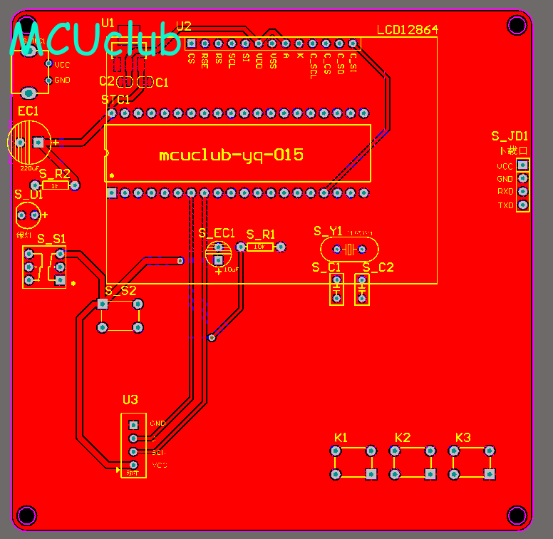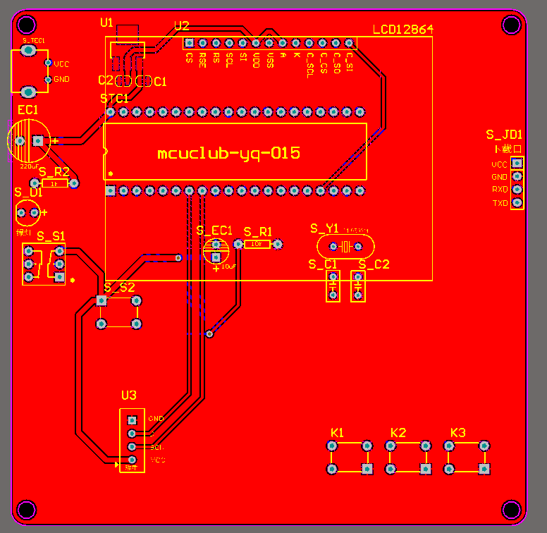 注意:PCB图中间有一个项目编号,隐藏在单片机底座下,插入单片机后不会看到。如果想截没有项目编号的PCB图,可在PCB源文件中点击删除。另外,如果想在实物PCB板上加自己的信息(比如日期、学号、姓名等),可联系客服。