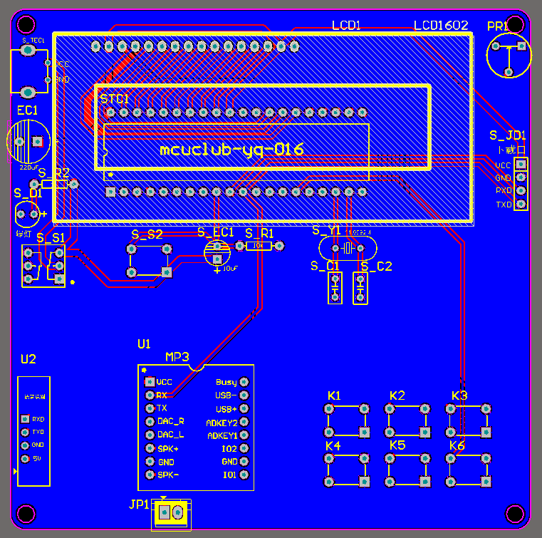 注意:PCB图中间有一个项目编号,隐藏在单片机底座下,插入单片机后不会看到。如果想截没有项目编号的PCB图,可在PCB源文件中点击删除。另外,如果想在实物PCB板上加自己的信息(比如日期、学号、姓名等),可联系客服。
