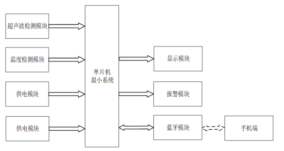 2、通过HC-SR04超声波测量当前距离值,当距离值在最小距离值的2/1~1之间,声光报警频率为300ms,当距离值小于距离最小值的1/2时,声光报警频率为100ms;