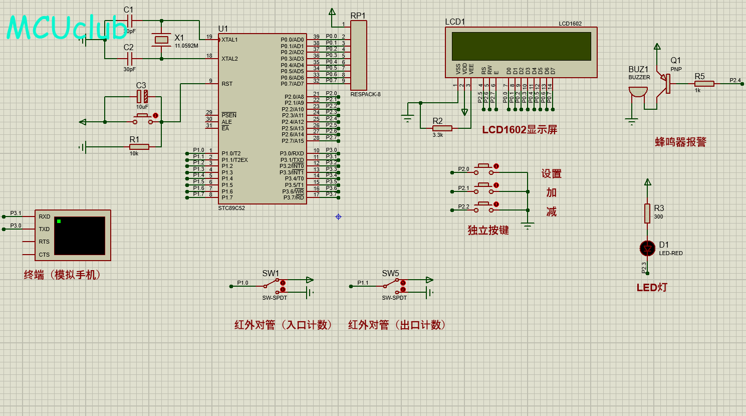 1、通过两对分离式红外对射管模拟前后门计数;