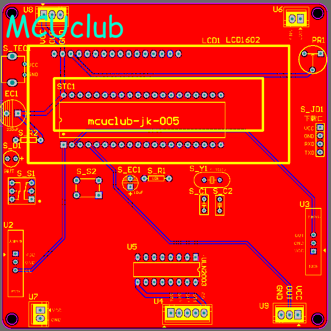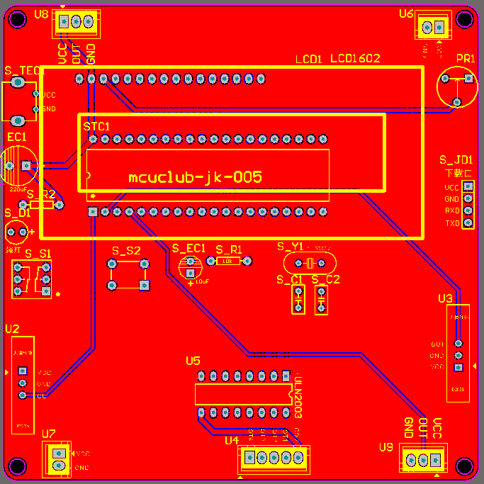 注意:PCB图中间有一个项目编号,隐藏在单片机底座下,插入单片机后不会看到。如果想截没有项目编号的PCB图,可在PCB源文件中点击删除。另外,如果想在实物PCB板上加自己的信息(比如日期、学号、姓名等),可联系客服。
