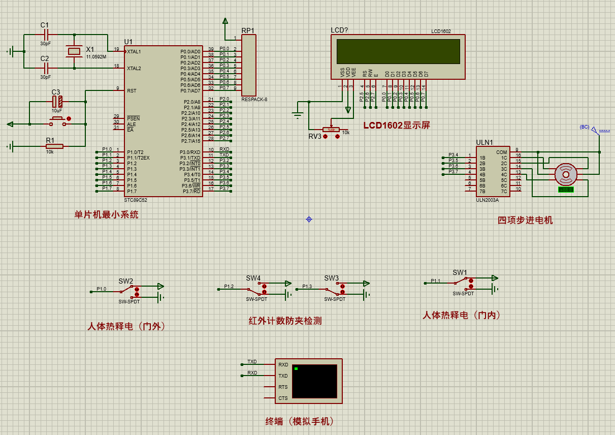 1、利用两个人体红外热释电检测内外部是否有人,有人则自动开门,5s后关门(步进电机模拟门)