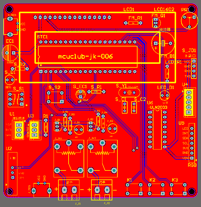 注意:PCB图中间有一个项目编号,隐藏在单片机底座下,插入单片机后不会看到。如果想截没有项目编号的PCB图,可在PCB源文件中点击删除。另外,如果想在实物PCB板上加自己的信息(比如日期、学号、姓名等),可联系客服。
