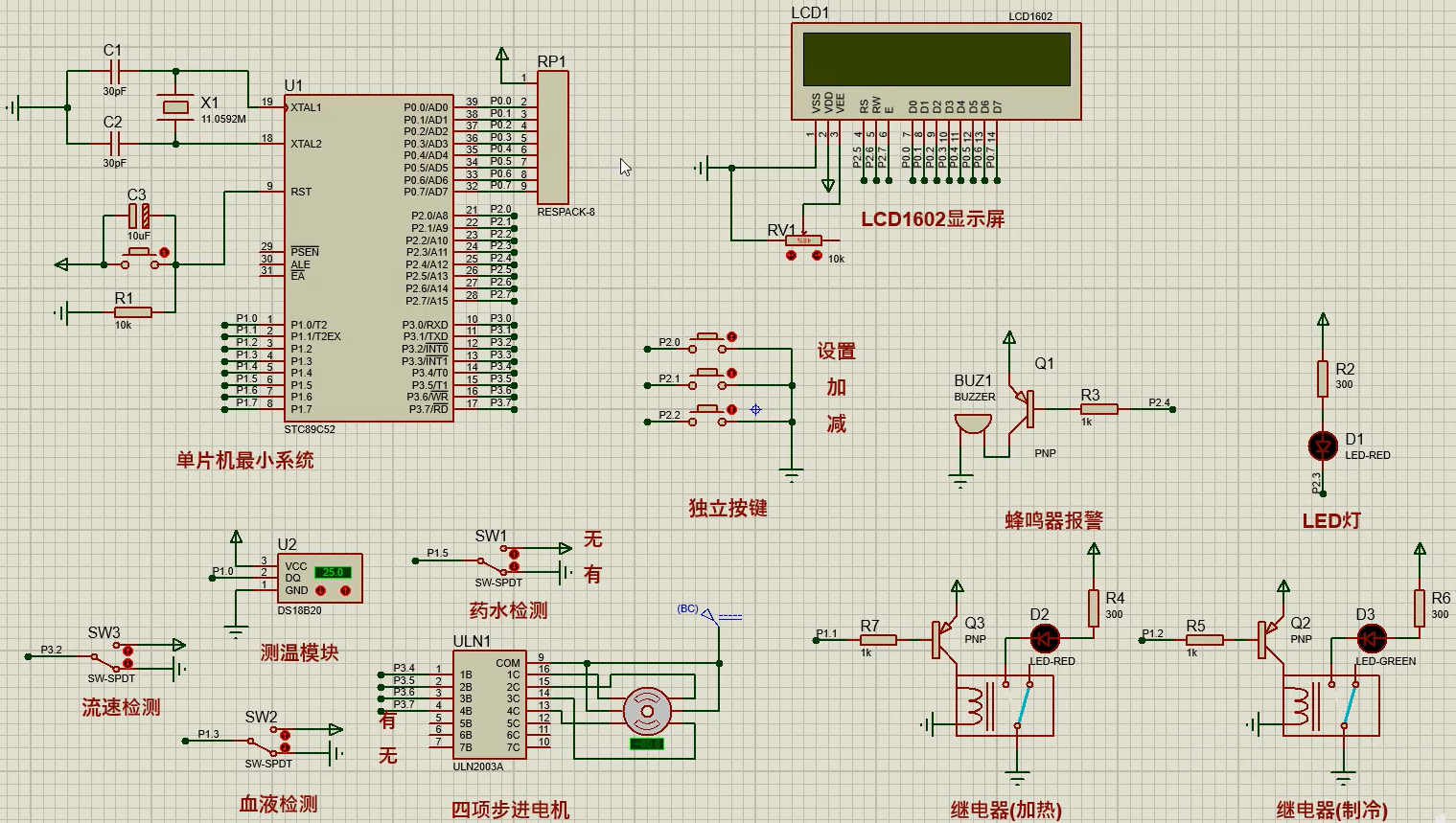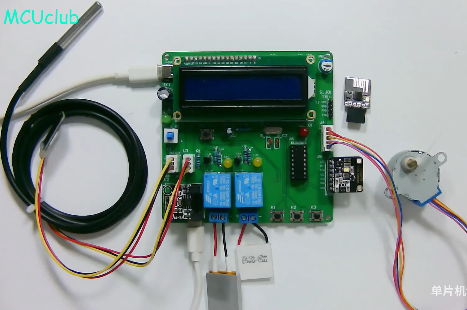 3、通过DS18B20检测温度值,当温度值超过设置的上下限,进行加热或制冷