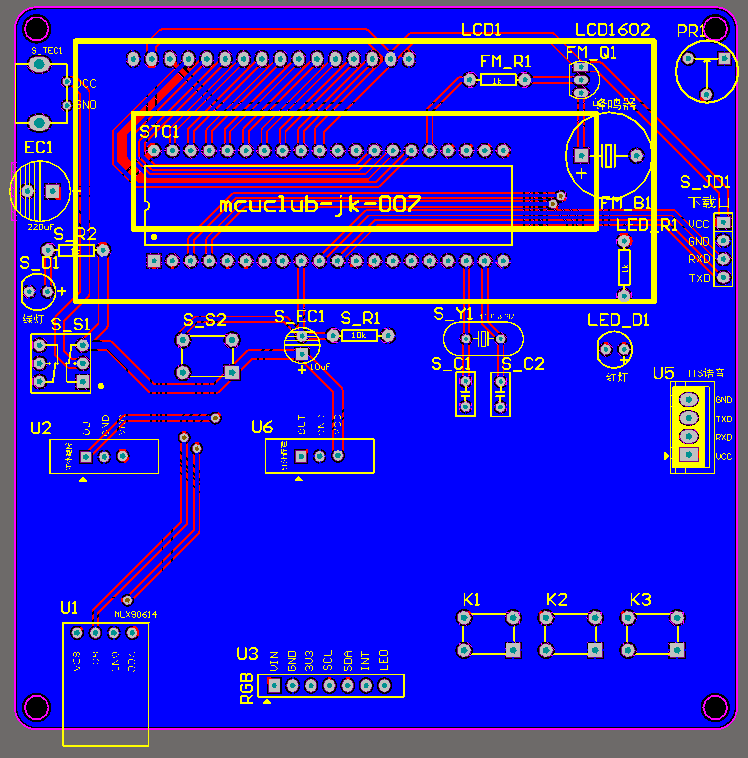 注意:PCB图中间有一个项目编号,隐藏在单片机底座下,插入单片机后不会看到。如果想截没有项目编号的PCB图,可在PCB源文件中点击删除。另外,如果想在实物PCB板上加自己的信息(比如日期、学号、姓名等),可联系客服。