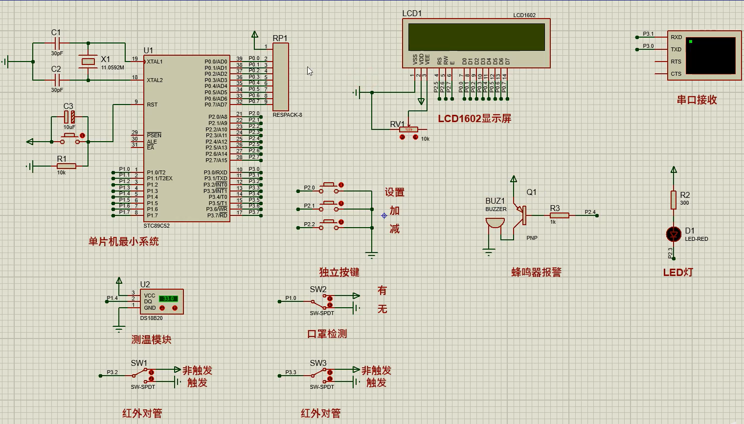 伴随着科学技术的发展,人们的生活质量也得到大幅度的提升,人们对生活用品的质量和精度要求也越来越高。针对目前市面上都是接触式人体温度检测,比如现在很多医院还在使用水银测温,虽然对人体的温度检测较为准确,但是水银测温计不小心打破,流出来的汞蒸气对人们的身体有害,而且污染环境。设计一款安全的,没有污染的,非接触的测温系统就显得很重要了。本设计以STC89C52单片机为核心设计的一款红外测温系统。该系统包括单片机最小系统、红外非接触测温MLX90614、颜色检测电路等,非接触测温MLX90614用来检测人体的温度、颜色检测电路检测是否佩戴口罩;红外避障管检测当前是否有人,蜂鸣器报警用来提醒当前检测者的温度不在正常的范围内,按键可以根据具体情况进行人们此时正常的温度范围、显示屏显示当前检测的环境温度和人体的检测温度。语音电路,当检测到有人,语音播报当前检测温度及当前温度是否正常或者过高过低;当人体温度超过设定的阈值的时候进行报警提醒,而且该设计是非接触的,使用较为安全。