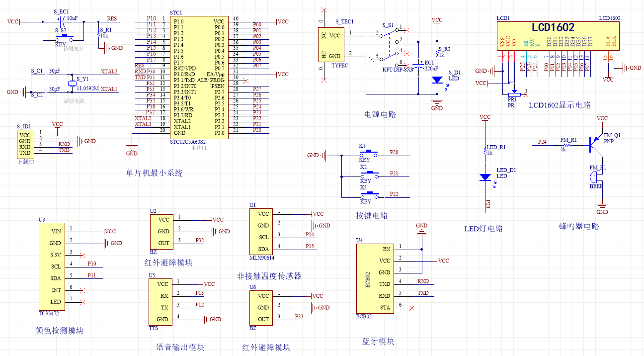 With the development of science and technology, people’s quality of life has also been greatly improved, and people’s requirements for the quality and accuracy of daily necessities are getting higher and higher. In view of the current contact human temperature detection on the market, for example, many hospitals are still using mercury temperature measurement. Although the human temperature detection is more accurate, the mercury thermometer is accidentally broken, and the mercury vapor flowing out is harmful to people’s health and pollutes the environment. It is very important to design a safe, pollution-free, non-contact temperature measurement system.This design takes STC89C52 single chip microcomputer as the core to design an infrared temperature measurement system. The system includes the minimum system of single chip microcomputer, infrared non-contact temperature measurement MLX90614, color detection circuit, etc. The non-contact temperature measurement MLX90614 is used to detect the temperature of the human body, and the color detection circuit detects whether to wear a mask; The infrared obstacle avoidance tube detects whether there is a person at present. The buzzer alarm is used to remind the current detector that the temperature is not within the normal range. The key can be used to carry out the normal temperature range of people at this time according to the specific situation. The display screen displays the current detected ambient temperature and human body detection temperature. Voice circuit: when someone is detected, the voice broadcast will tell whether the current detection temperature and current temperature are normal or too low; When the human body temperature exceeds the set threshold, an alarm will be sent to remind the user. The design is non-contact and safe to use.