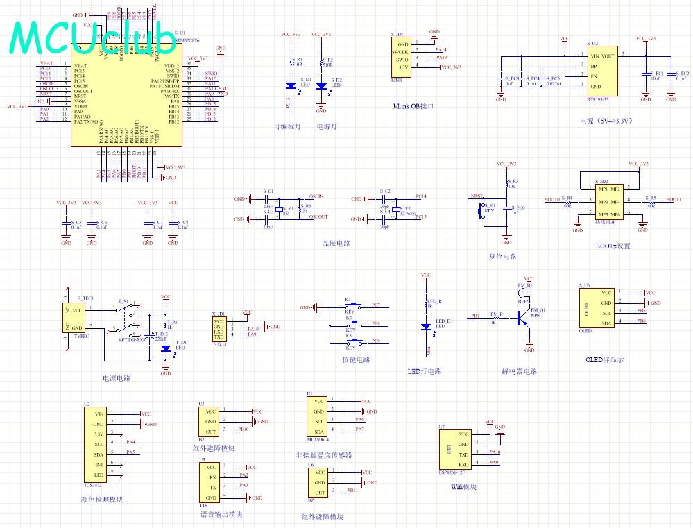PCB图是由原理图导出,封装很大一部分都是作者自己绘制,不提供封装库,只提供连接好的源文件,可以直接在嘉立创进行打板。两层板,上下覆铜接地。