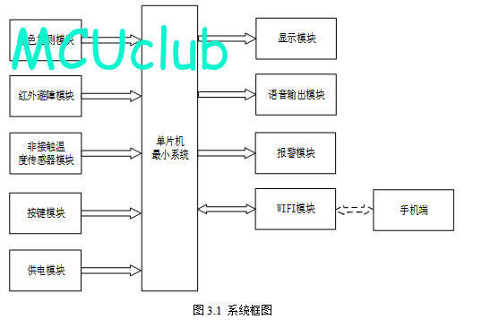 2、通过非接触红外测温配合红外避障管检测人体温度,超过设定值进行语音提醒,并声光报警