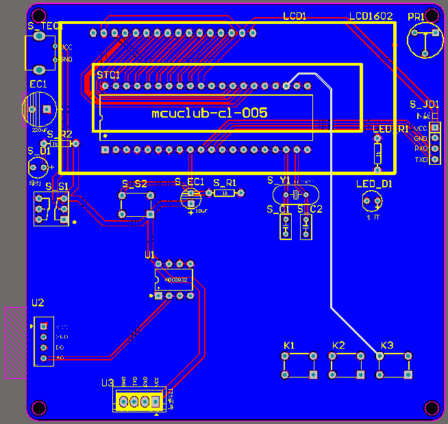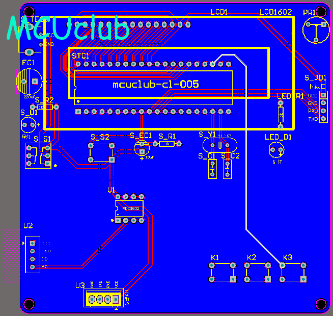 注意:PCB图中间有一个项目编号,隐藏在单片机底座下,插入单片机后不会看到。如果想截没有项目编号的PCB图,可在PCB源文件中点击删除。另外,如果想在实物PCB板上加自己的信息(比如日期、学号、姓名等),可联系客服。