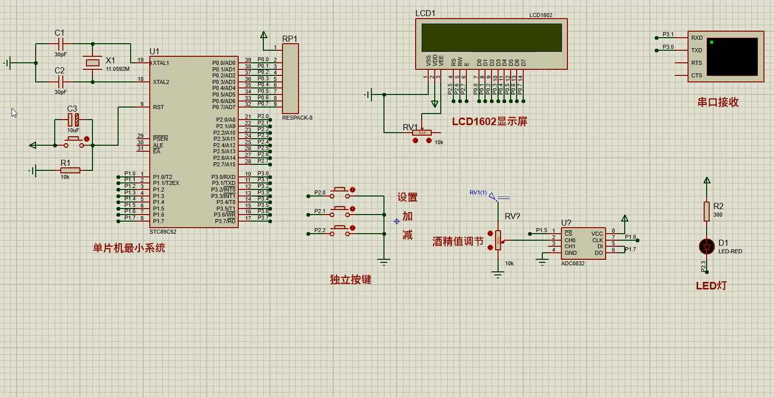 关键词:酒精检测;声光报警;LCD1602液晶显示;STC89C52
