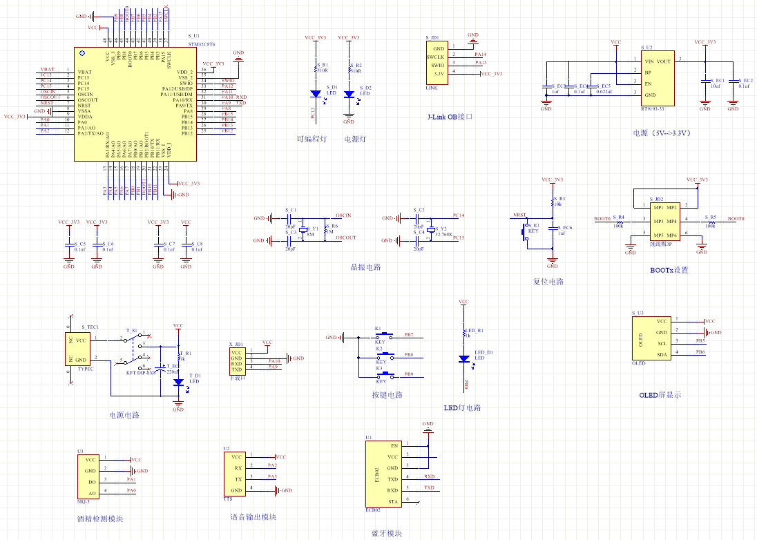 PCB图是由原理图导出,封装很大一部分都是作者自己绘制,不提供封装库,只提供连接好的源文件,可以直接在嘉立创进行打板。两层板,上下覆铜接地。